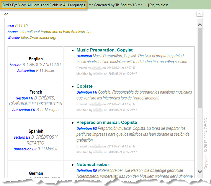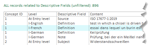 This feature allows a panoramic view of a given concept containing all 3 levels (entry level, language level and term level), all languages and all existing Descriptive Fields as long as there is information available.