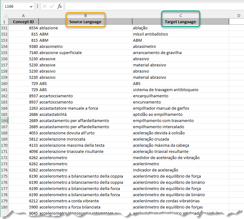 There are two ways to get to the same place, that is, to a two-column table (SL and TL) ready to be exported to Excel: