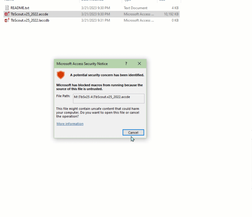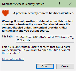 "Microsoft Access Security Notice A potential security concern has been identified. Warning: It is not possible to determine that this content came from a trustworthy source. You should leave this content disabled unless the content provides critical functionality and you trust its source. File Path: [Location of Tb-Scout v3.3] This file might contain unsafe content that could harm your computer. Do you want to open this file or cancel the operation?" |